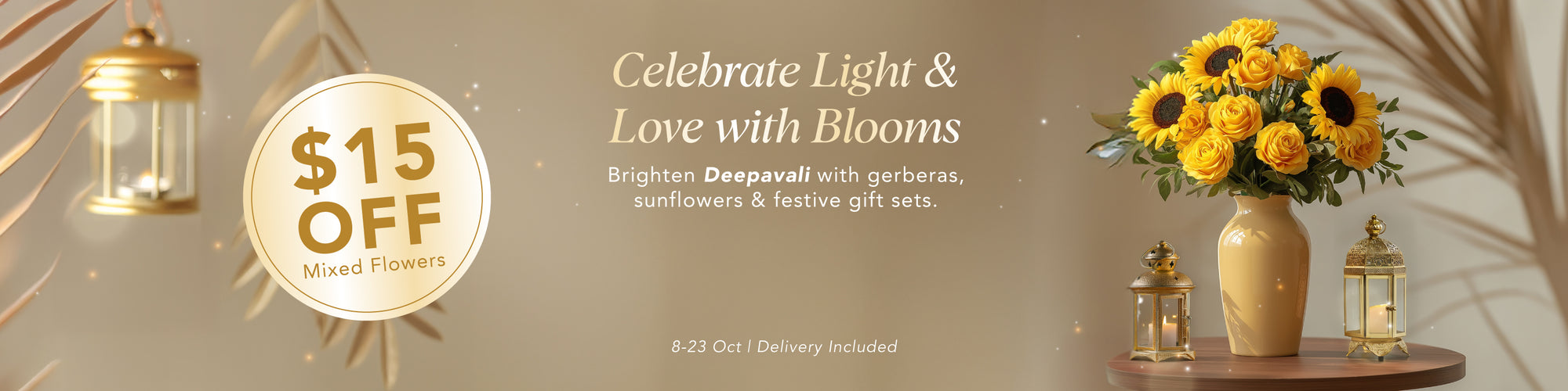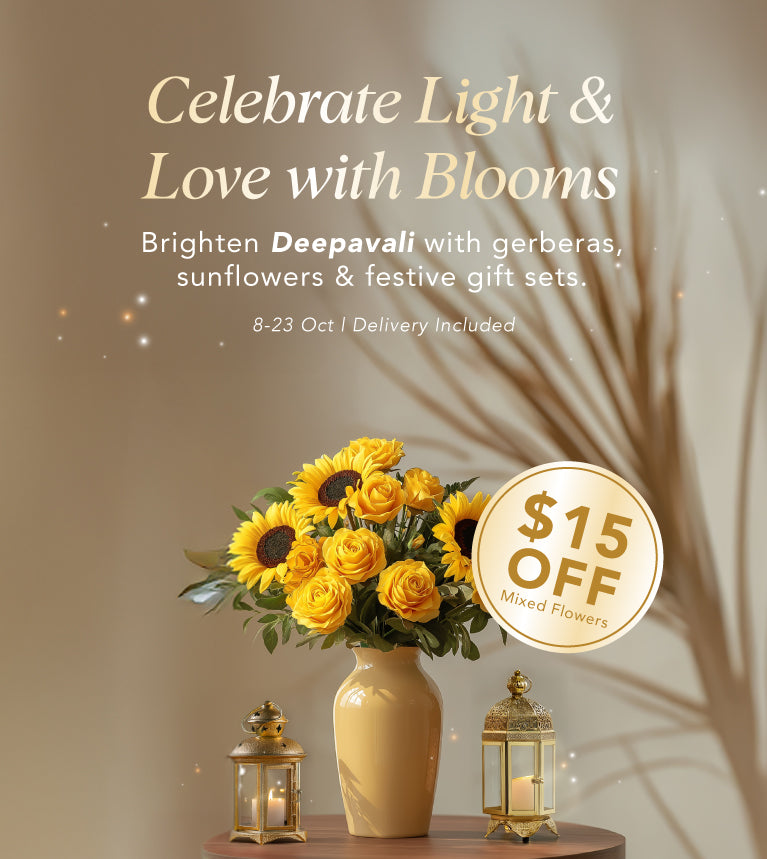 Celebrate the Festival of Light with our radiant bouquets and festive gift sets. Shop the collection now to enjoy $15 OFF your mixed flower order, which includes delivery. (Valid 8 - 23 Oct) | Discount auto-apply at cart