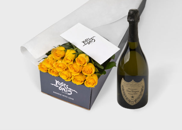 Beautiful long-stemmed yellow roses in our signature gift box and a bottle of DOM Perignon Vintage Champagne (750ml)