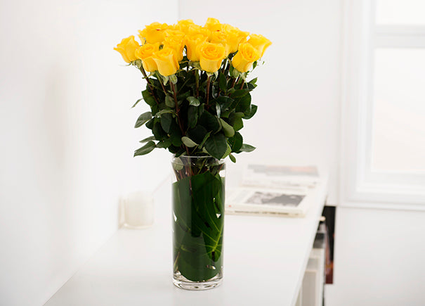 Compliment your box of yellow roses with a premium glass vase, and have these beautiful blooms seated on office table of your loved ones.
